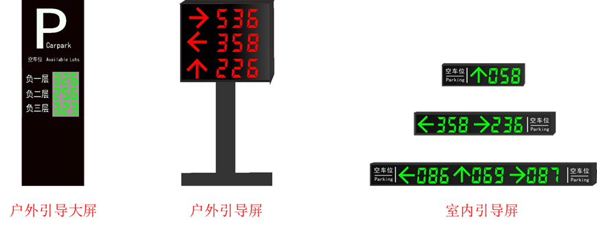 户外引导大屏:由高亮度LED模组、驱动电路、支架等部分组成,安装在停车场的每个入口处,用于显示停车场内剩余车位信息。接收集中控制器的车位统计信息,用数字和文字等形式实时显示当前停车场空车位数量,提示入场的车辆司机,24小时全天候使用。